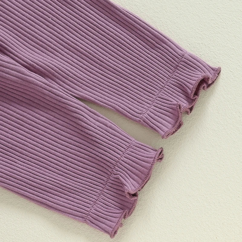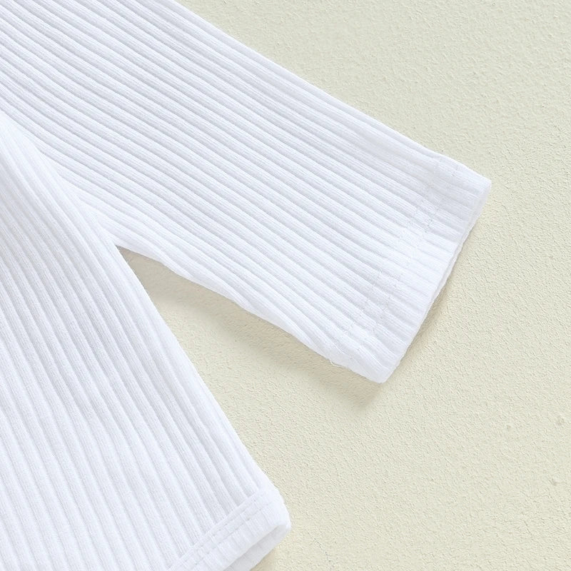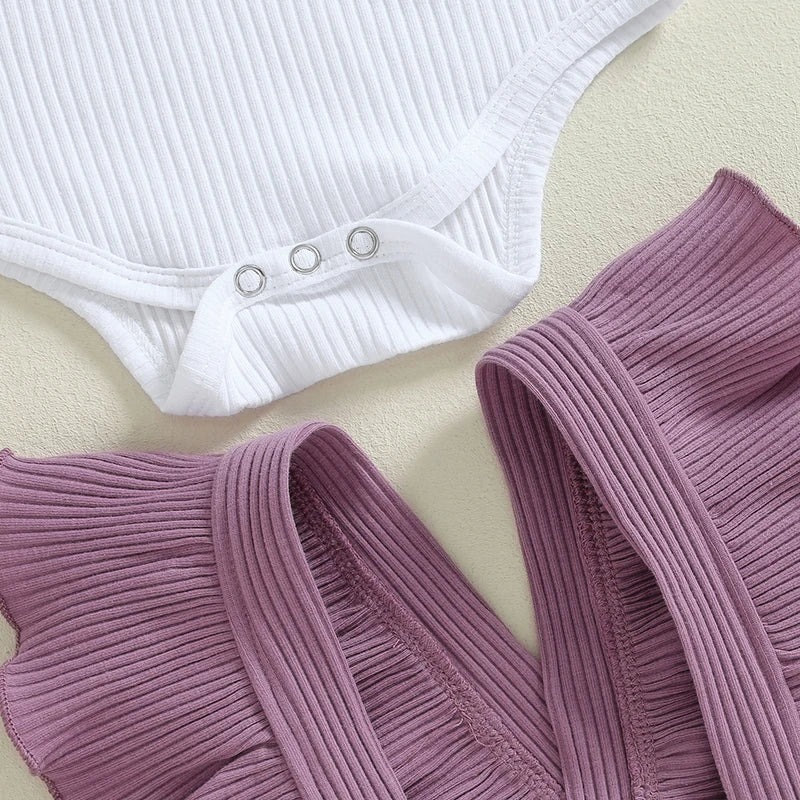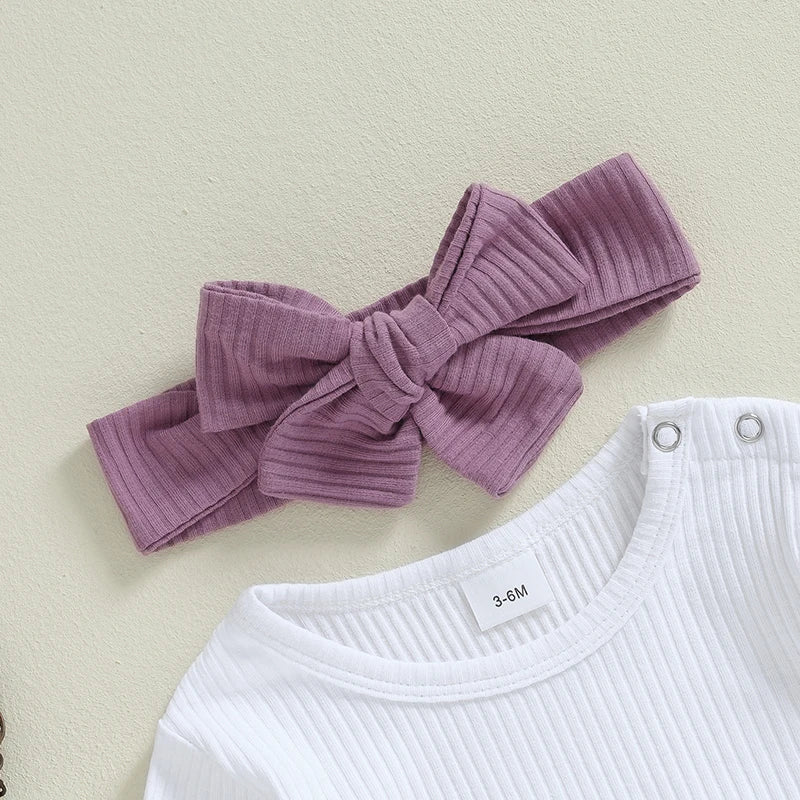 Baby Girls 3Pcs Ribbed Long Sleeve Romper with Ruffle Trim Overalls Pants Headband Set for Fall