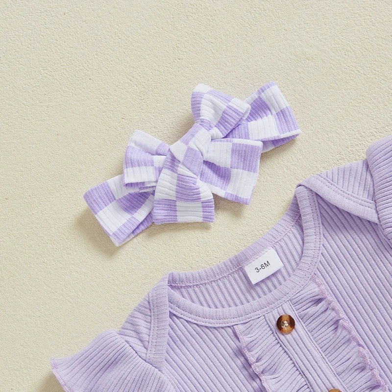 Baby Girls 3Pcs Summer Spring Clothes Solid Ribbed Short Sleeve Romper with Checkered Print Flare Long Pants and Headband Set