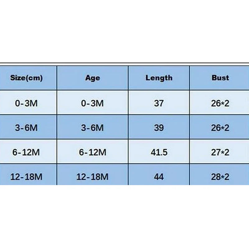 0-3M Length: 14.57 Bust: 19.68 Sleeve: 8.07 Suggest Age: 0-3 Months