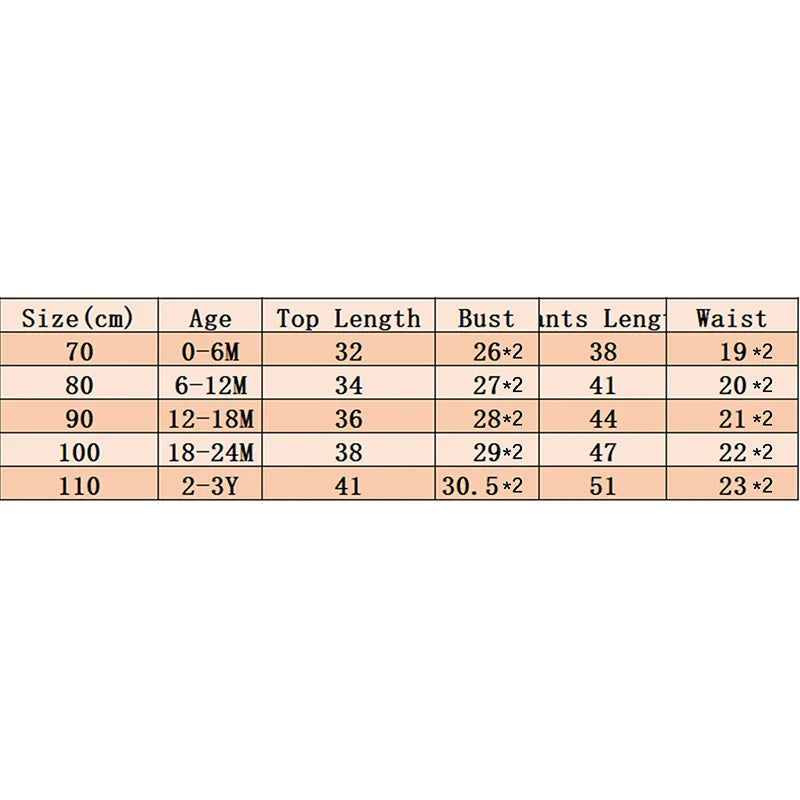 80 Tops Length: 13.39 Bust: 21.26 Pants Length: 16.14 Waist: 15.75 Advised Age: 6-12 Months