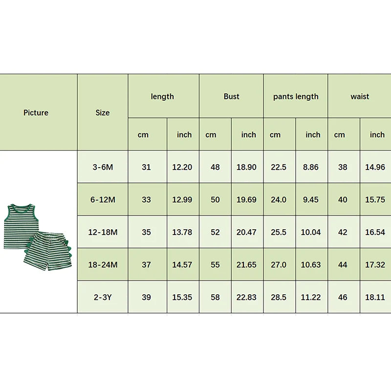 3-6M Tops Length: 12.20 Bust: 18.90 Pants Length: 8.86 Waist: 14.96 Advised Age: 3-6 Months