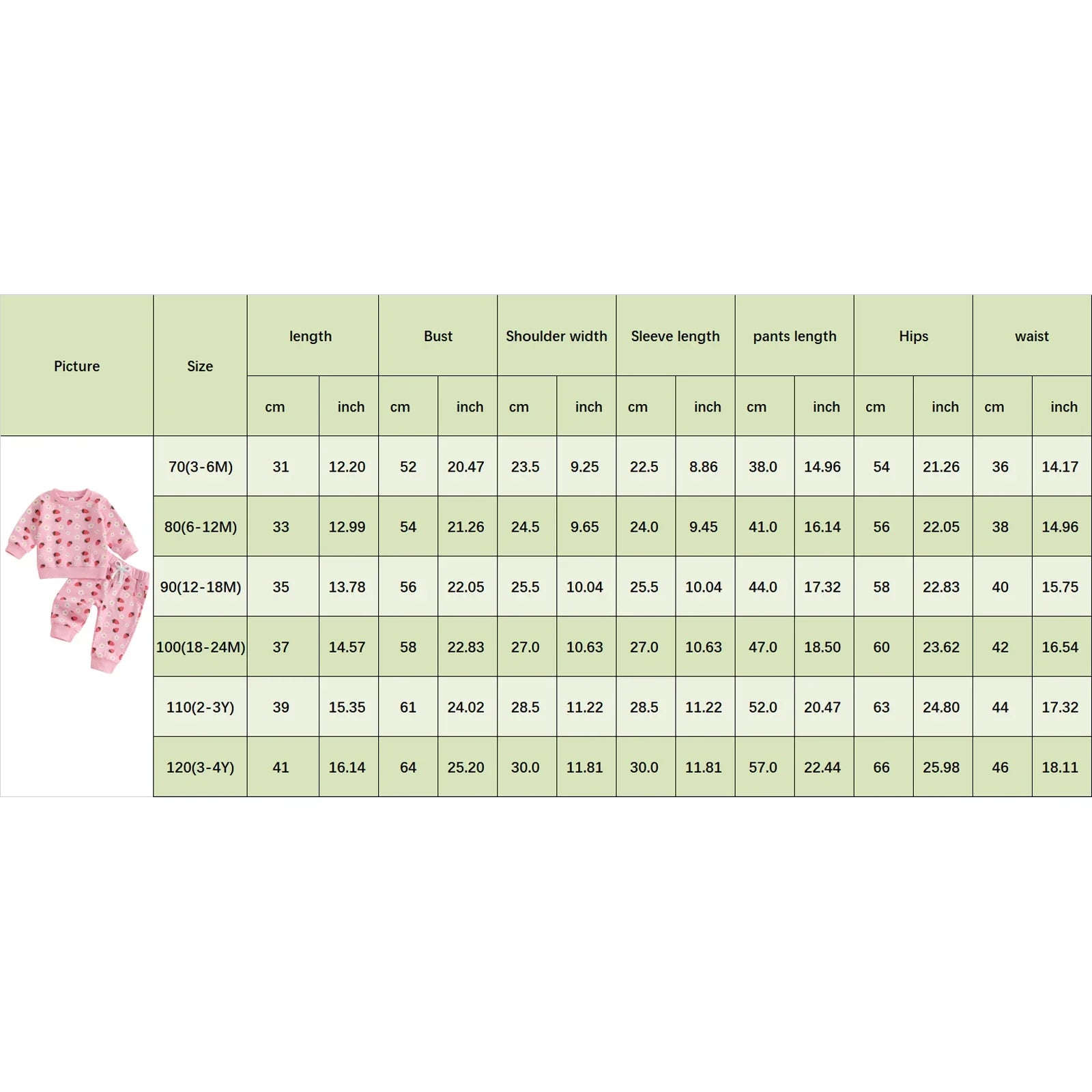 2-3Y Tops Length: 15.35 Bust: 24.02 Shoulder: 11.22 Sleeve: 11.22 Pants Length: 20.47 Waist: 17.32 Hip: 24.80 Advised Age: 2-3 Years