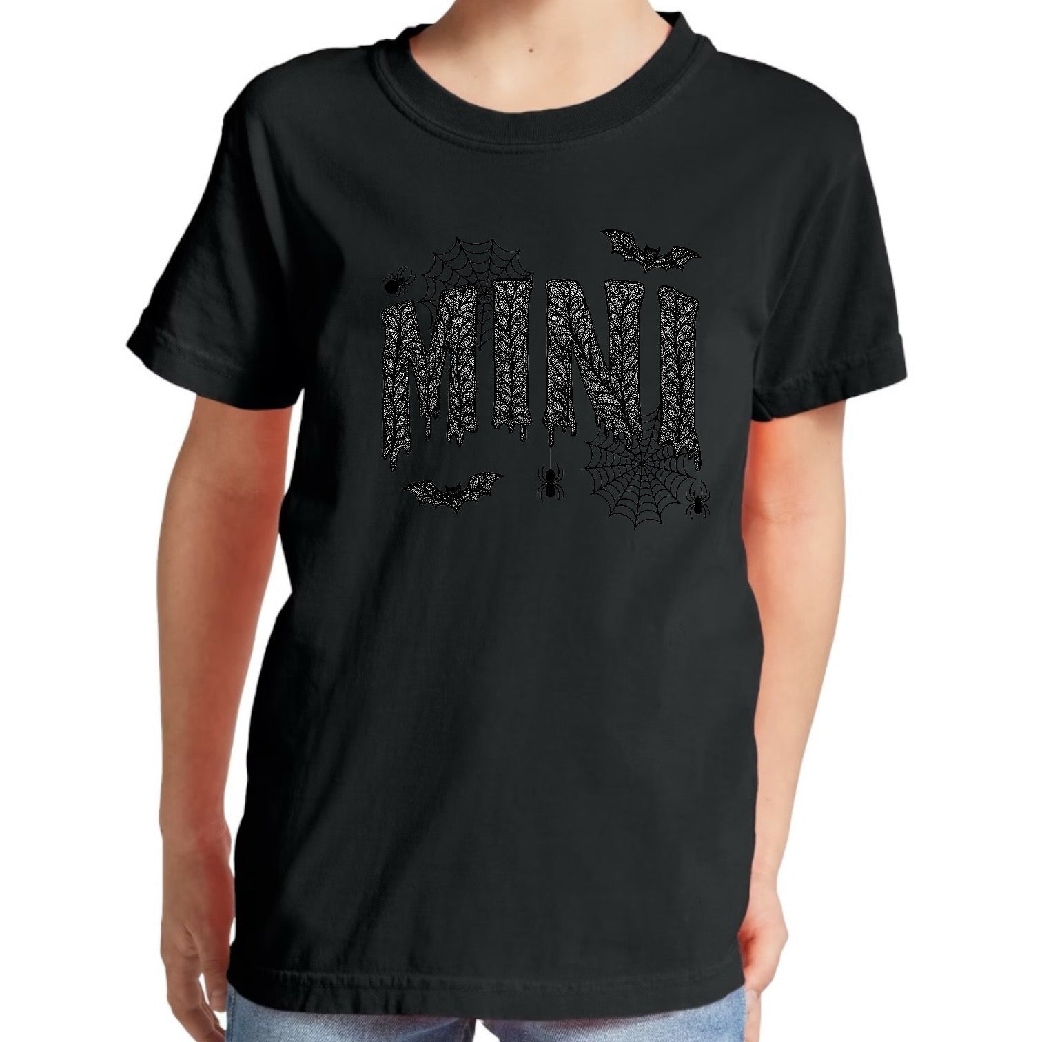 Spooky season just got a whole lot cuter! Our Mini Halloween tee is made for the little ghouls and goblins who love to match with Mama. Featuring a playful Halloween design with bats and spider webs, this tee brings all the festive vibes without the fright.